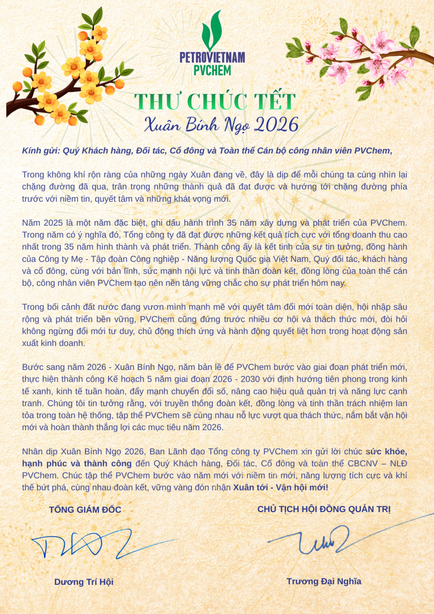 Nhân dịp Xuân Bính Ngọ 2026, Ban Lãnh đạo Tổng công ty PVChem xin gửi lời chúc sức khỏe, hạnh phúc và thành công đến Quý Khách hàng, Đối tác, Cổ đông và toàn thể CBCNV – NLĐ PVChem. Chúc tập thể PVChem bước vào năm mới với niềm tin mới, năng lượng tích cực và khí thế bứt phá, cùng nhau đoàn kết, vững vàng đón nhận Xuân tới - Vận hội mới!